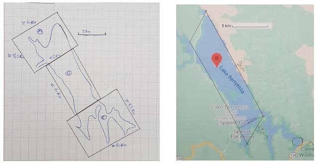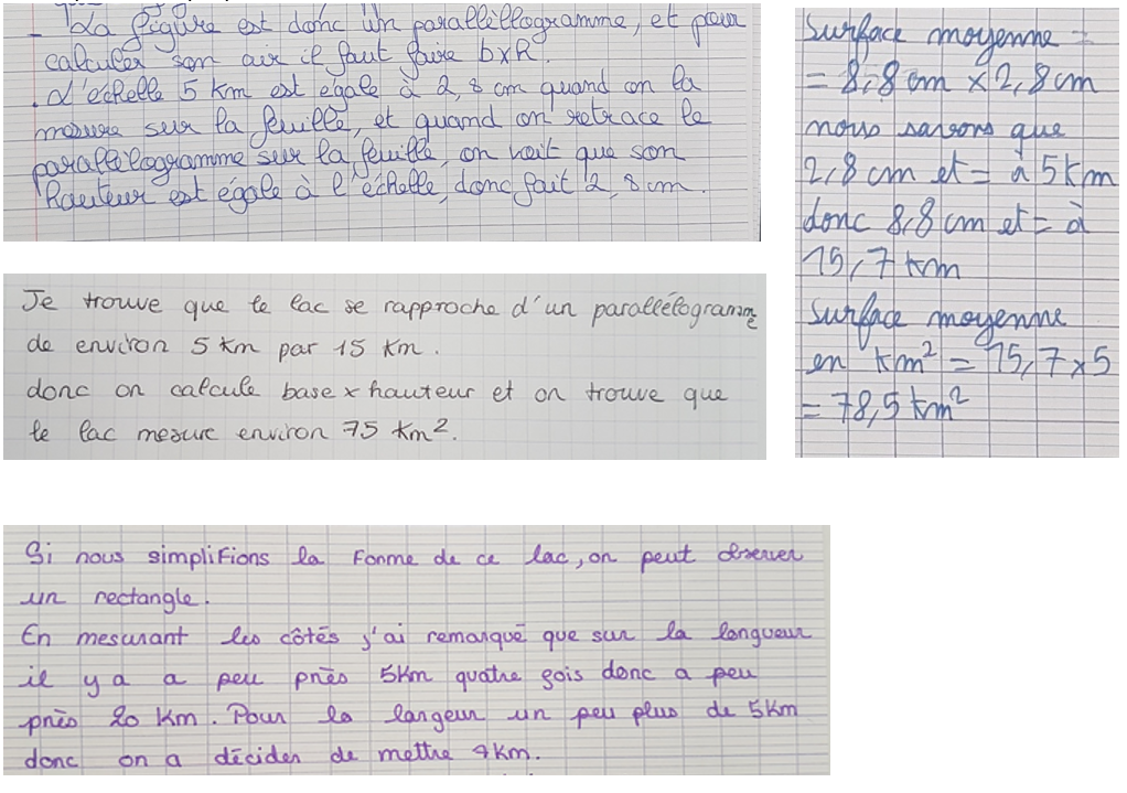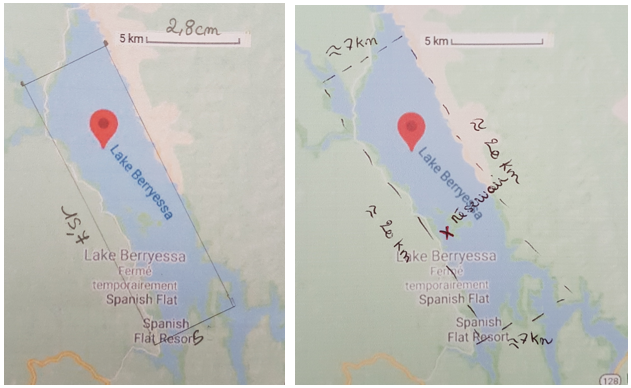 « pour donner une estimation de l’Aire du lac il faut prendre l’échelle de graduation de la carte qui est égal à 5km pour 2,5cm, ensuite on va venir faire un rectangle approximatif du lac avec l’échelle graduée. J’ai donc pris les mesures sur la carte et j’estime que le rectangle fait du 4km sur 20km. 4x20=80km² »