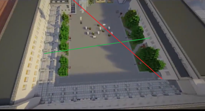 D'autre élèves proposent une vue en coupe qui permet d'avoir accès à la hauteur. La coupe choisie est naturelle par rapport aux axes de la cours, mais devrait plutôt se faire le long des voies des tyroliennes. | |