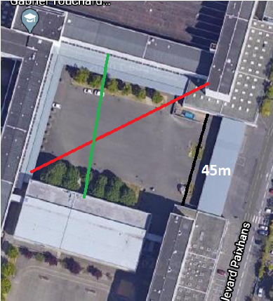 - La voie 2 (rouge), entre le 2ème étage du bâtiment C et le 1er étage du bâtiment A