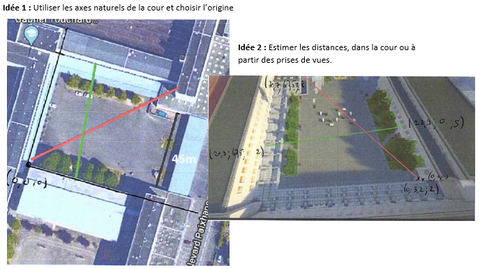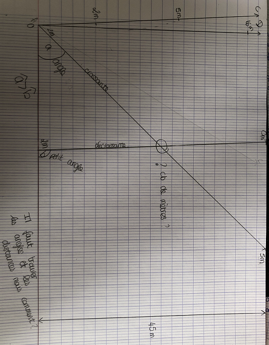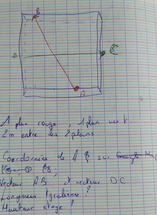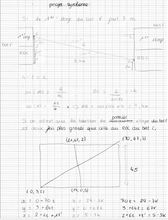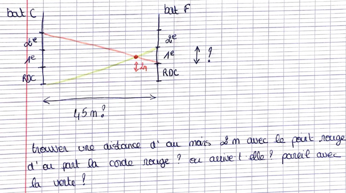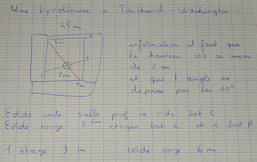 Les premières propositions collent à la photo proposer, une vue de dessus qui donne un modélisation « plate » de la situation. Les élèves se rendent compte qu'ainsi ils peuvent pointer le point de croisement mais pas mesure la hauteur entre les deux câbles à ce moment. On a perdu une dimension | |