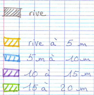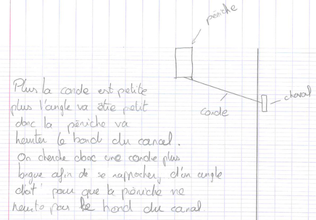 Les élèves ici mettent en avant qu’un angle aigu proche de 0° permet une traction plus efficace. Une légende est donnée sur le code couleur pour indiquer l’importance apparente de la distance à la rive. Il manque néanmoins une indication claire du sens. Après discussion, les élèves précisent qu’un angle droit ne permet pas de traction. Quant à un angle obtus, cela n’est manifestement pas efficace du tout car la péniche « part » en arrière par rapport à la direction souhaitée.
