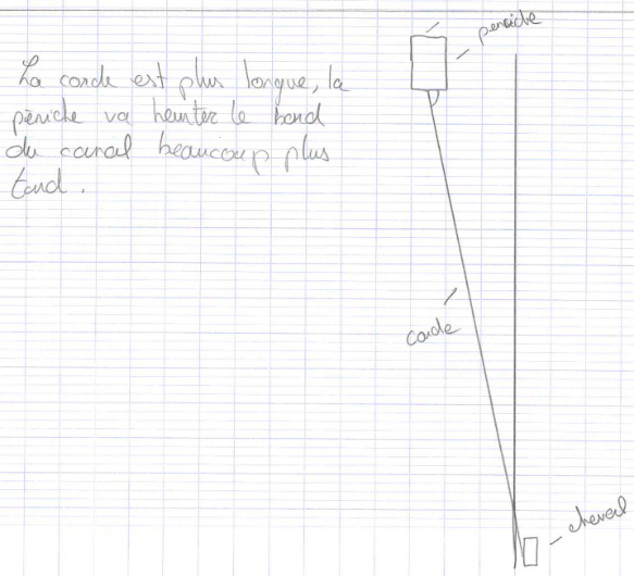 Après une recherche individuelle, quelques questions apparaissent autour de la compréhension du problème. Que signifie « une longueur de corde étant donnée » ? La discussion autour de cette longueur ne dure que peu de temps. Il est proposé soit de fixer une longueur (100 mètres) soit de donner une valeur l (en mètres). Au final, les élèves ne comprennent pas bien quels calculs effectuer. Je leur fais remarquer qu’il n’est pas demandé, à priori, d’effectuer des calculs mais d’expliquer la position des chevaux pour une traction efficace. Il s’agit donc de définir un modèle d’efficacité. Il s’agit alors donner un schéma de la situation. La modélisation se rapproche davantage de la compétence représenter : il faut d’abord comprendre les paramètres en jeu avant de proposer un modèle. Les derniers moments de la séance (environ 10 minutes) servent à mettre en place cette modélisation/représentation.