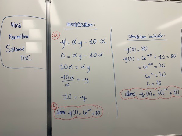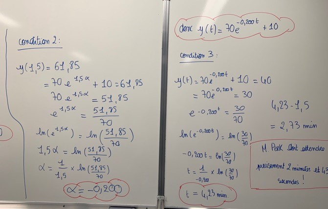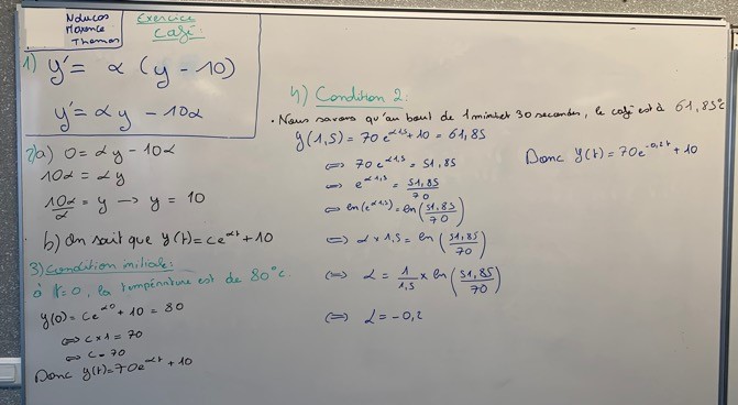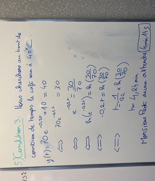 Ce qui avait été fait avant : les élèves ont étudié un problème similaire dans une activité collective Source (Manuel Déclic Hachette Maths Complémentaires problème 118 page 91 « Dans une cuisine dont la température ambiante est constante et égale à 22°C, Justine suis la recette d'une tarte qui doit cuire dans un four à la température de 180°C et doit être servie à 25°C. Vingt minutes après avoir sorti la tarte du four, Justine contaste que la température de la tarte a diminué de 80°C. » Cette activité a été résolue en classe la semaine précédant la séance de la tasse à café. Ce qui a été fait le jour de cette séance sur la tasse à café : les élèves ont formé des groupes de 3 et chaque groupe disposait d'une salle de classe (les séances de mathématiques complémentaires dans mon lycée ont lieu le mercredi après-midi… 9 salles disponibles pour mes 9 groupes d'élèves…). Les élèves ont donc pu travailler directement sur un tableau. Chaque groupe disposait d'environ 20 minutes pour produire une solution. Voici quelques exemples de productions.