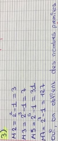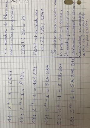On appelle nombre de Mersenne un nombre de la forme : M_n=2n-1 avec n un nombre entier supérieur ou égal à 2. 1. Calculer les dix premiers nombres de Mersenne. 2. Obtient-on toujours des nombres premiers ? 3. Et si l’on remplace n par un nombre premier, le nombre de Mersenne obtenu est-il premier ?