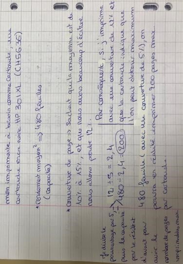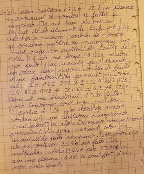 Pour la partie recherche, beaucoup d’élèves confondent taille d’une police et police elle-même. Ils se sont également souvent contentés de rechercher un nombre de feuilles nécessaires mais environ un tiers des élèves a pensé à rechercher le prix de l’encre. Deux élèves ont produit une réponse en format numérique. Parmi les idées des élèves concernant l’encre : • Site internet proposant d’imprimer les pages. • Formule d’abonnement mensuel avec des forfaits en fonction du nombre de pages. • Nombre de pages par cartouche