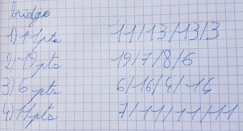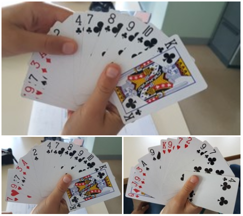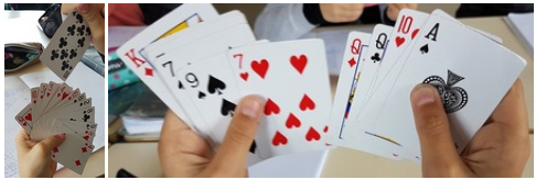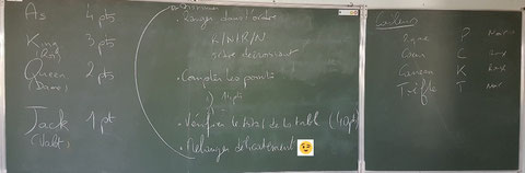Une activité ludique, qui a déjà du sens dans un "scénario classique", devient ici indispensable. Mon choix se porte sur un travail sur la mise en ordre (croissant ou décroissant) et un peu de calcul, et pour cela, je vais m'appuyer sur le bridge. Nul besoin de connaitre ce jeu pour cette activité : juste utiliser la valeur des cartes (As, Roi, Dame et Valet, toutes les autres cartes valant 0 point dans ce jeu).