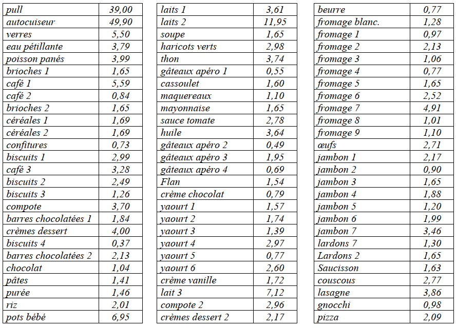 Voici le relevé de prix sur les 20 premières pages d’un catalogue d’une grande surface