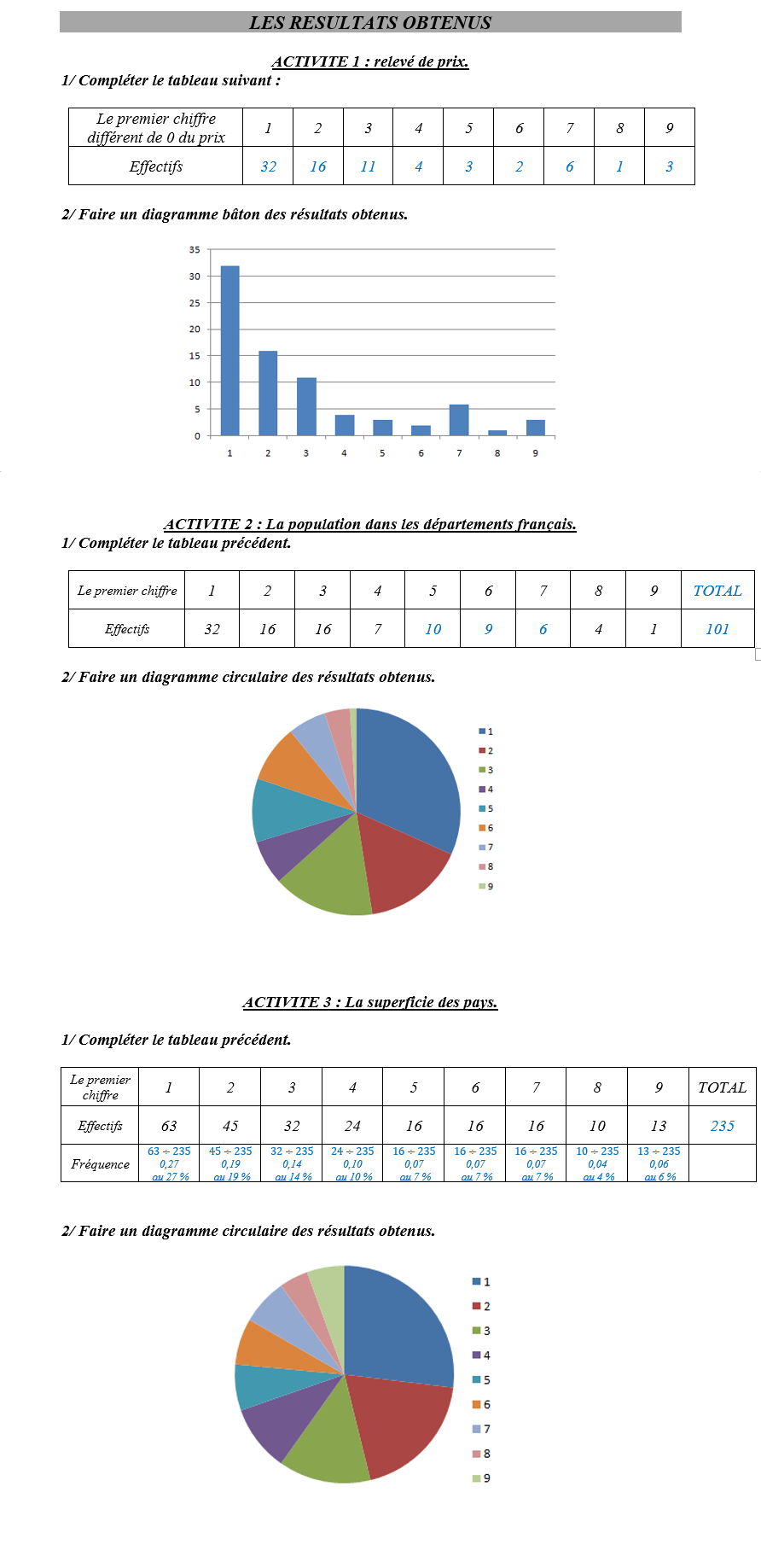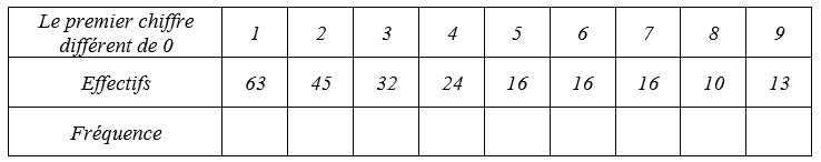 Les élèves font l’activité sans connaitre l’énoncé de la loi de Benford et émettent des suggestions sur ce qu’ils trouvent de surprenant dans les résultats obtenus.