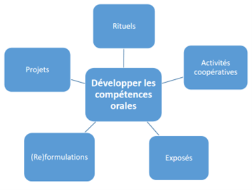 Une première partie de ce document portant sur différentes approches de l’oral avec les élèves rejoindra le schéma ci-contre en s’appuyant sur différentes mises en œuvre en classe.