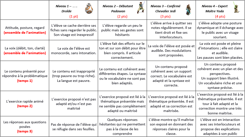 Évaluation : Chaque exposé a été évalué par une note établie à l’aide de la grille ci-dessous.
