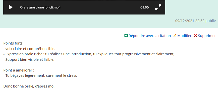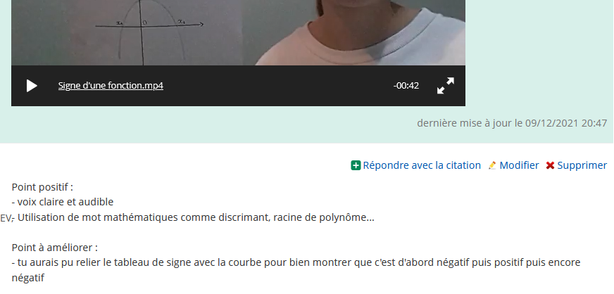 Il s’agit ici de construire un élément du cours. Les élèves sont par groupe de 4. La consigne est proposée sous la forme d’une vidéo, réalisée par le professeur, autour du signe d’une expression du second degré du type ax²+bx+c (a, b, c réels). L’exemple est le cas où le discriminant est négatif et « a » est strictement positif. Les élèves se répartissent les autres cas et ils doivent se filmer chez eux en expliquant le moyen de trouver le signe de l’expression. Chaque vidéo peut être vue par les autres membres du groupe et commentée tant sur le fond que sur la forme toujours en utilisant la grille liée au grand oral. Peu de groupes ont bien utilisé la possibilité offerte par le fil de discussion de commenter la vidéo des camarades. Ceux qui s’en sont saisis ont eu une discussion plus riche et formatrice lors du retour en classe.