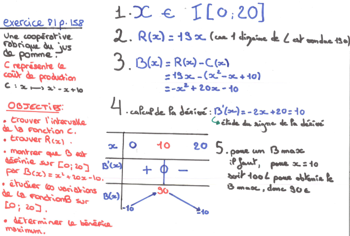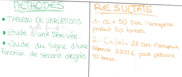 Pour chaque groupe, le professeur propose un bilan écrit des différentes prestations. Sur le fond, c’est notamment la précision du vocabulaire qui peut être travaillée. Exemple : l’expression « la courbe est positive » est souvent employée pour le signe. C’est l’occasion de reparler de la différence entre courbe, qui peut être en effet « au-dessus de l’axe des abscisses » et « image par une fonction » qui peut être positive. Un point important est que le cours a été mieux appris et retenu par ce choix de restitution via une vidéo. Par la suite, la référence à ce travail lors des recherches de signes d’expressions a semblé entrainer moins d’erreurs que les autres années.
