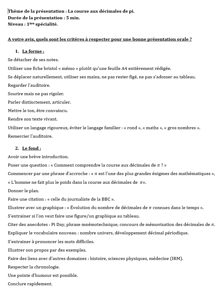 - Les élèves ont ensuite préparé, à la maison, une présentation orale de 5 min sur le thème de la course aux décimales de pi (le thème est volontairement ouvert pour diversifier les approches possibles).