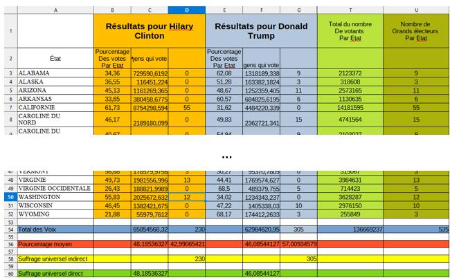 Comme il est précisé dans le fichier lié à l’activité “PRESENTATION DU MODE DE SCRUTIN AMERICAIN”, plus précisément dans “LE FICHIER ELEVES A COMPLETER”, la règle du scrutin américain y est ici simplifiée.