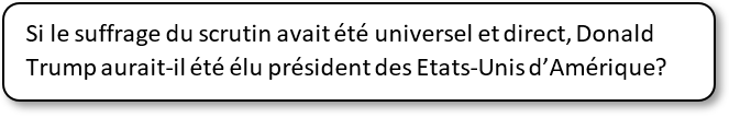 S’ensuit une discussion sur l’universalité du scrutin, puis une discussion autour du modèle américain, qui sera précisé dans l’activité suivante.