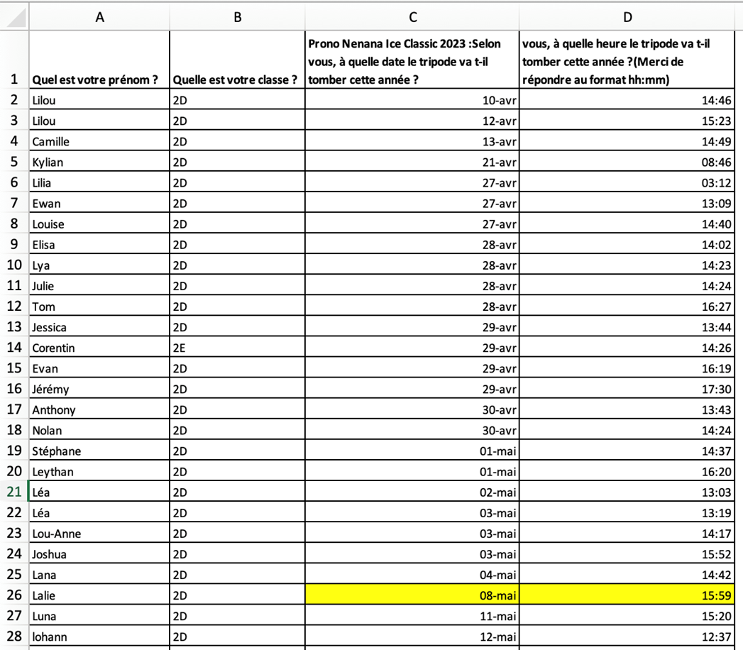 Nous regardons les pronostics des élèves en classe et voyons que la jeune Lalie avait trouvé la bonne date et presque la bonne heure (à 2 minutes près…)