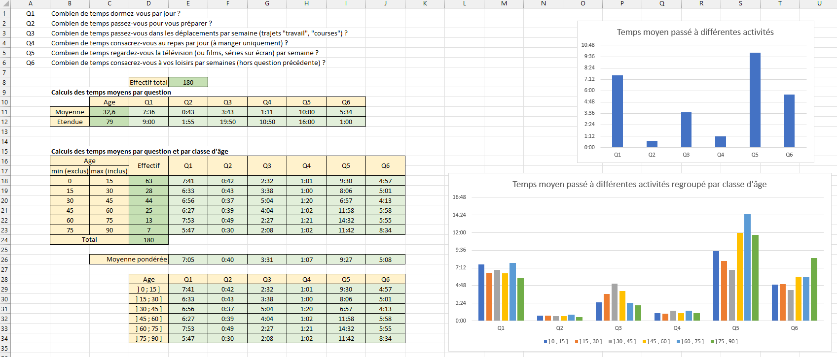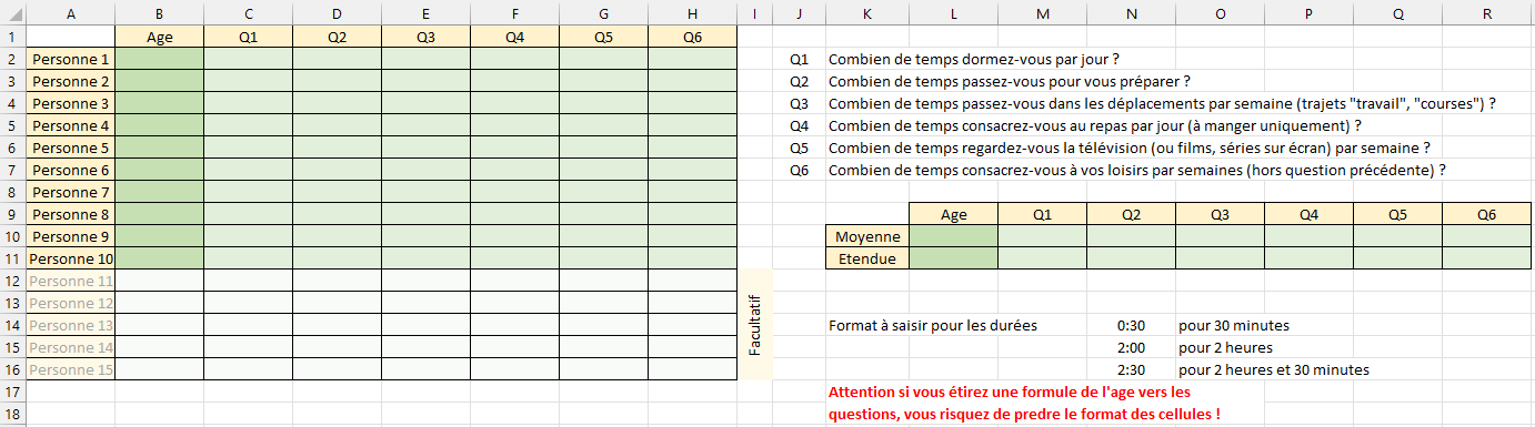 - calculer la moyenne et l’étendue pour chaque question en utilisant une formule.