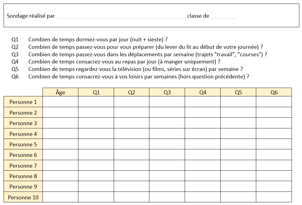En classe entière, les élèves découvrent le projet proposé qui consiste à élaborer un sondage commun, puis à le proposer à 10 personnes (de tout âge) de notre entourage pour finalement regrouper toutes les valeurs ensemble afin de réaliser une étude plus proche de la réalité que les exercices d’entrainement que l’on peut trouver dans les livres.
