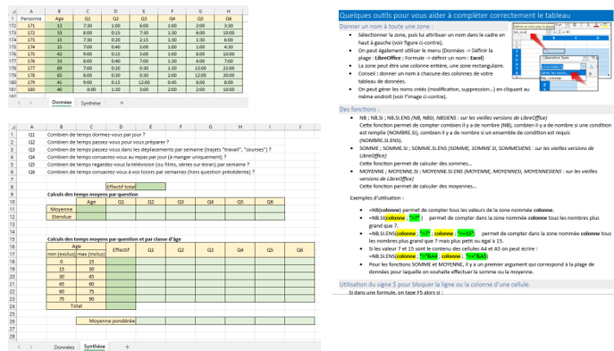 - un fichier tableur avec 2 onglets (un pour les données brutes, un autre pour la synthèse en partie commencée),