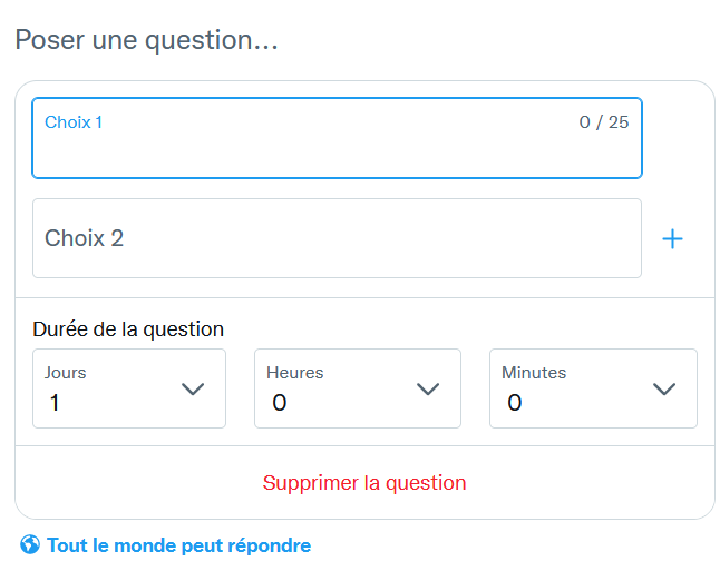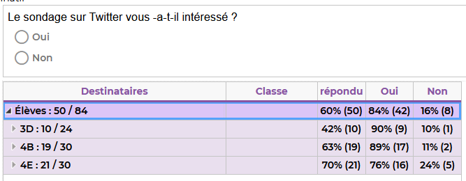 Avec les classes, les questions suivantes ont été choisies, et sont restées disponibles une semaine pour que les utilisateurs de twitter y répondent ; elles sont présentées avec les résultats finaux :