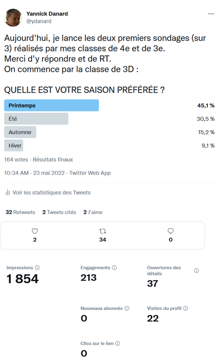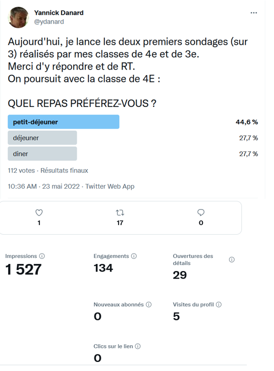 Disposant depuis plusieurs années d'un compte Twitter, l'idée de l'utiliser pour un sondage "réel" avec des classes m'est venue.