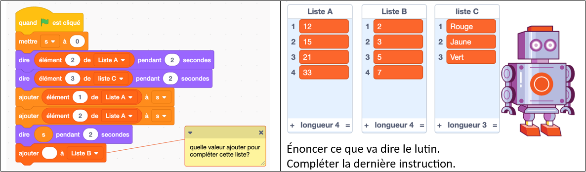 Avant de donner l’activité aux élèves, je conseille de préparer les élèves en amont à l’aide de plusieurs questions flash données sur plusieurs séances. L’objectif est de consolider la compréhension de l’utilisation des variables et la découverte des listes.