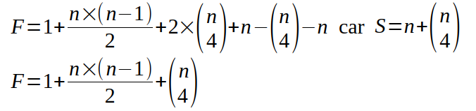 En entrant depuis le sommet du haut dans le polygone, on a S=1. F, le nombre de surFaces est égal à A-1 car du sommet partent n arêtes et le sommet appartient à n-1 faces.