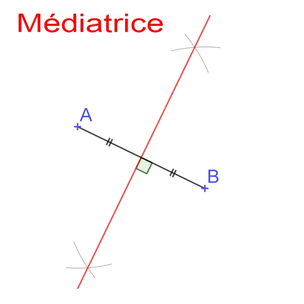 Reconnaitre la médiatrice d'un segment (cette droite coupe le segment en son milieu perpendiculairement).La médiatrice d'un segment est l'ensemble des points à égale distance des extrémités d'un segment.