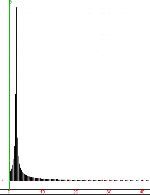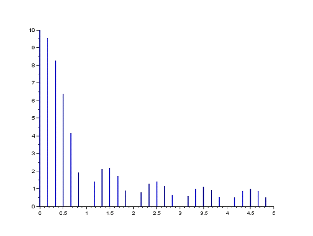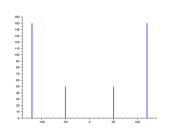 Situation d'accroche : le graphique ci-dessus représente la transformée de Fourier discrète d'un signal. Il s'agit d'observer les particularités de ce graphique et de conduire des calculs permettant de les justifier mathématiquement.