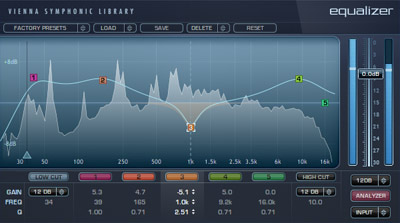 Le graphique ci-contre représente la TFD d’un signal audio donné par un logiciel. On y fait un traitement numérique audio d’égalisation (courbe numérotée 1-2-3-4-5) qui consiste à amplifier ou atténuer avec précision certaines fréquences contenues dans le signal audio (enveloppe en arrière plan donnée par une TFD).