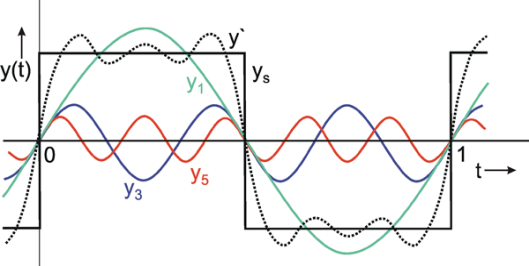 Le graphique ci-contre représente les trois premiers termes sinusoïdaux de la décomposition de Fourier dans le domaine analogique d’un signal carré ainsi que la somme de ces trois termes. On peut trouver dans l’exploitation de la TFD une équivalence dans le domaine numérique.