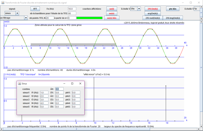 Ce logiciel (cliquer sur l'image pour le télécharger) fait le lien entre les mathématiques et la physique appliquée pour la transformée de Fourier discrète (programme de mathématique en BTS SN option IR). Il peut aussi servir en physique appliquée pour des parties de cours sur le signal numérique, l'échantillonnage, le traitement numérique et la représentation fréquentielle.