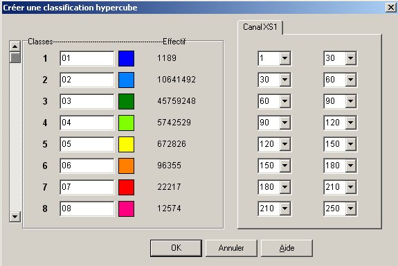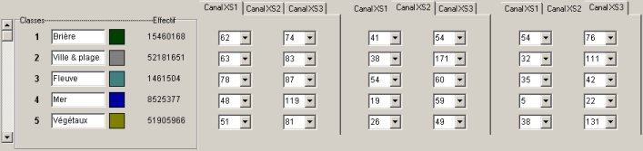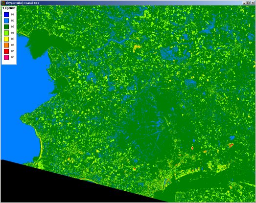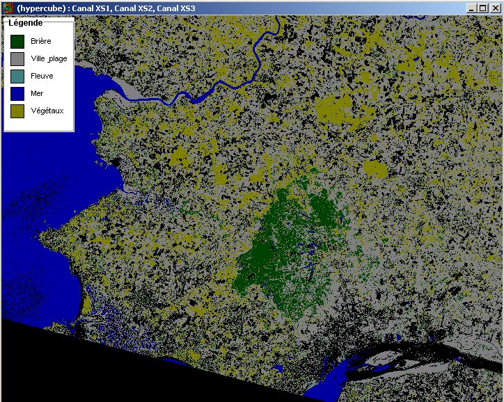 On a cherché à faire ressortir la Brière, les zones de ville et de plage, les végétaux, la mer et le fleuve. Pour cela, nous avons défini des sites témoins délimitant chacune de ces zones et relevé les valeurs. Puis, nous avons créé une classification hypercube à l'aide de ces valeurs. Voici les résultats :