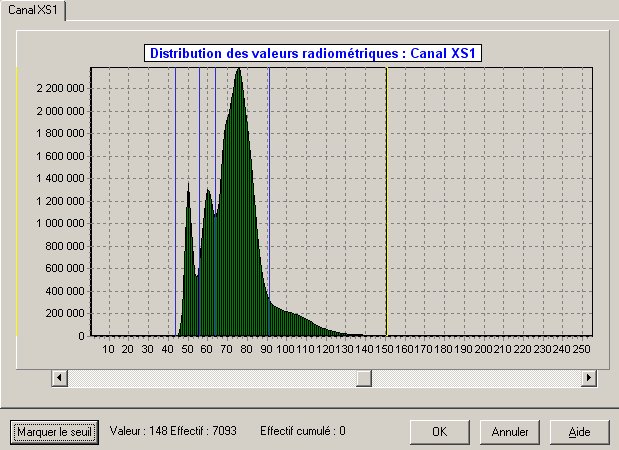 Première étape : On affiche l'histogramme de l'image puis on sélectionne des intervalles de valeurs correspondant par exemple aux différents pics de l'histogramme.