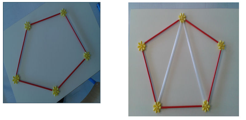 Les élèves ont ainsi proposé de construire la diagonale du carré pour rendre ses angles indéformables. En effet, ils ont fait le lien avec le cours de technologie où lors d'une séquence sur la stabilisation des structures, ils ont découvert le principe de la triangulation en construisant des maquettes.