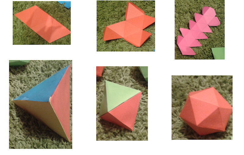 Exemples de patrons de tétraèdre, d'octaèdre et d'icosaèdre construits par les élèves :