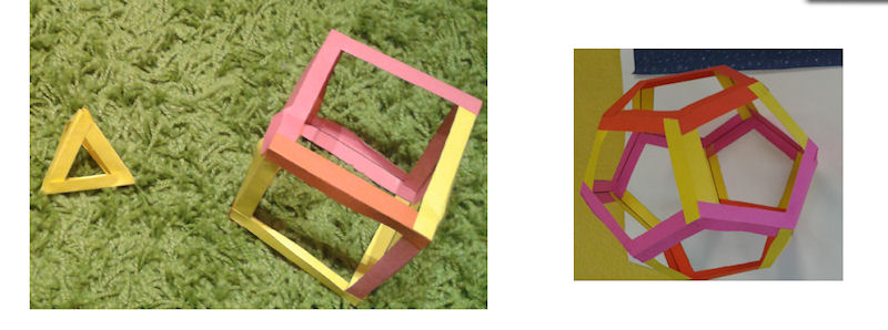 A partir du livre « L'atelier des polyèdres » de Michèle MINGUIN-DEBRAY (Édition ACL-Les éditions du kangourou), on a étudié une autre technique de construction des polyèdres : en construisant des cornières représentant les arêtes, on peut visualiser, les faces, les arêtes et les sommets tout en laissant le regard passer à travers le polyèdre.