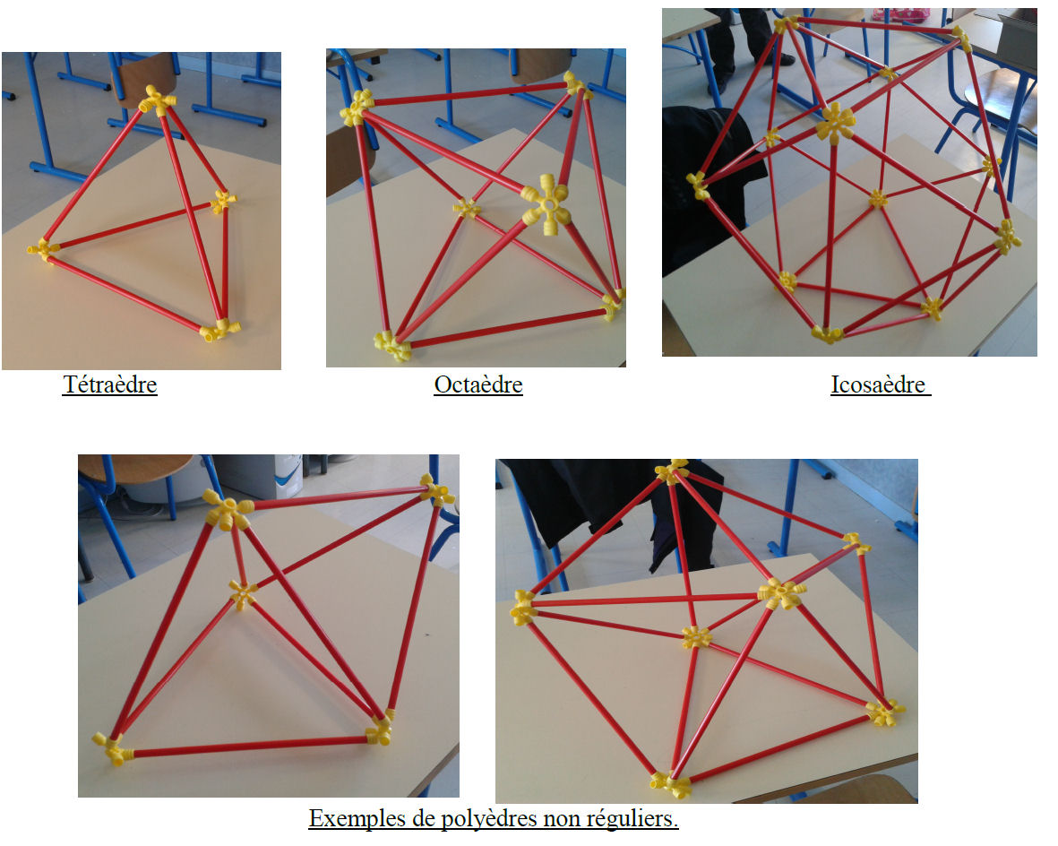 Chaque solide créé a été soumis à l'analyse de l'ensemble du groupe et était décrété comme polyèdre régulier ou non. A partir de ce travail, les élèves ont découvert 3 nouveaux polyèdres réguliers : le tétraèdre (4 faces), l'octaèdre (8 faces) et l'icosaèdre (20 faces).