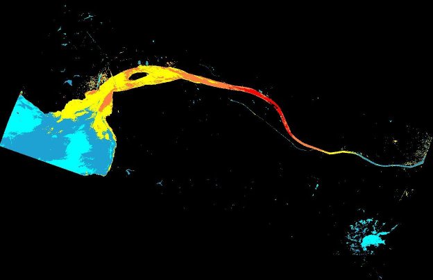 Pour cartographier la quantité de sédiments dans l'eau il faut utiliser une image ou un ensemble d'images prisent par un satellite. Puis en utilisant un logiciel, en prenant les valeurs radiométriques de différentes zones et en définissant une couleur pour chaque classe on peut obtenir une image en fausses couleurs représentant les zones plus ou moins vaseuses.