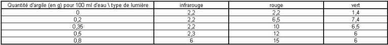 Les valeurs radiométriques de chacune des suspensions ont été mesurées dans le vert, le rouge et le proche infrarouge avec un radiomètre. Un tableau de résultat et un graphique ont été produits avec une feuille de calcul.