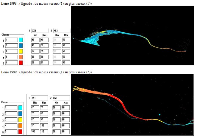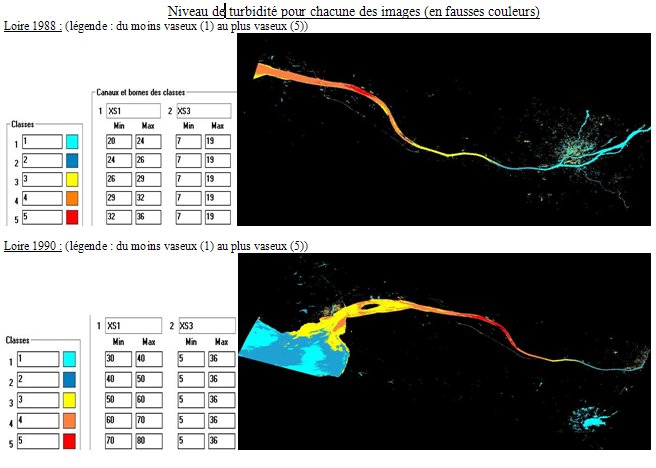 Nous avons créé des images en fausses couleurs sur TITUS 1. Nous nous sommes servi de photos de la Loire prises à différentes dates et périodes de l'année (1988, 1990, 1993 et 1999). Sur chaque photo, nous avons pu remarquer qu'une zone (souvent la même) était plus vaseuse. Nous en avons déduit qu'il y a un bouchon vaseux dans la Loire. Ce bouchon vaseux se déplace : ainsi en 1993 il se situait plus proche de la ville de Nantes, l'explication de ce phénomène est simple : la marée était haute à la prise de la photo. Sur les trois autres (1988, 1990 et 1999), il se trouvait vers St Nazaire.
