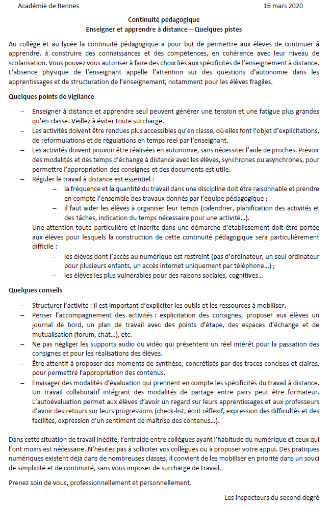 Premières réflexions sur la continuité pédagogique par les Inspecteurs du second degré de l'Académie de Rennes.
