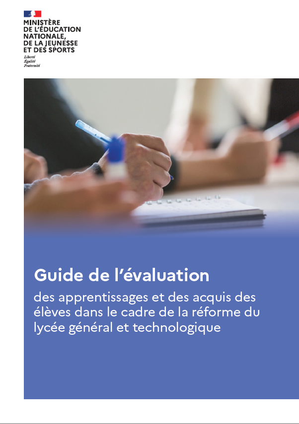 Ce guide de l’évaluation au service des apprentissages des lycéens s’adresse en premier lieu aux professeurs et aux cadres de l’éducation nationale, inspecteurs et personnels de direction, mais aussi aux familles et aux élèves. Dans le prolongement et en complément de la note de service « Modalités d'évaluation des candidats à compter de la session 2022 » du 28 juillet 2021 publiée au Bulletin officiel du 29 juillet, il expose à la fois des principes communs, des préconisations par discipline et par spécialité ainsi que des préconisations pour le pilotage général de l’évaluation.