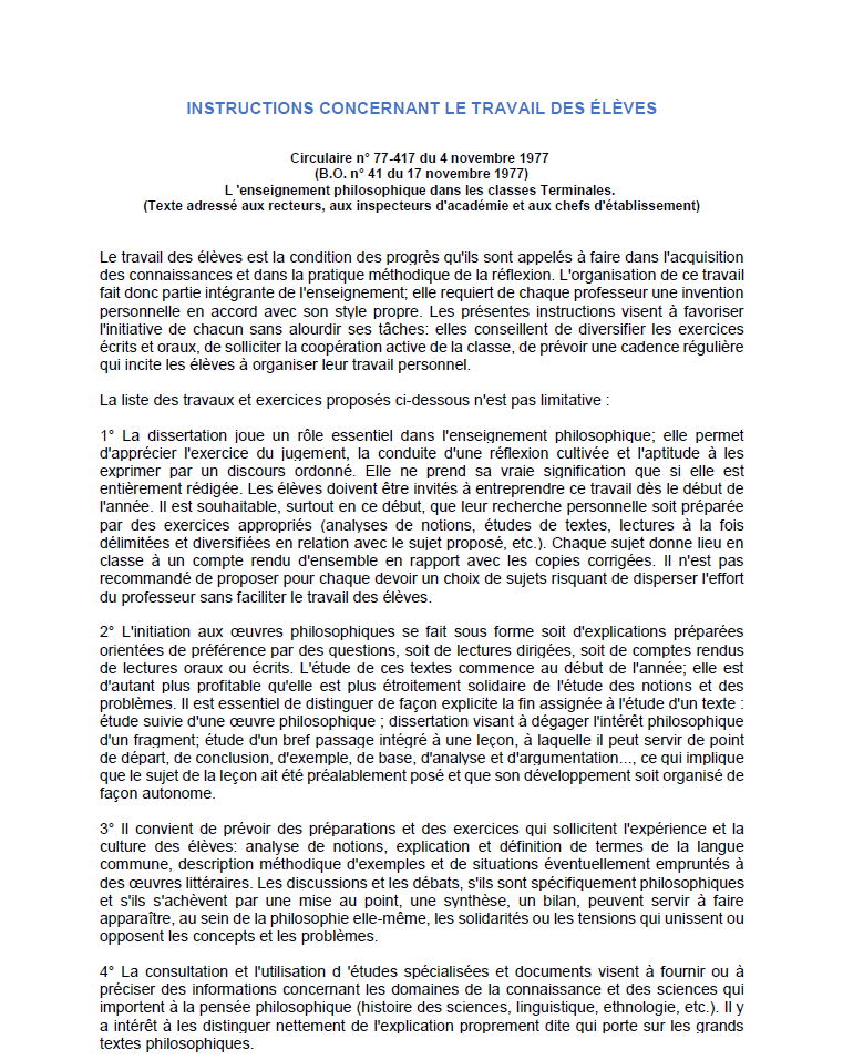 Publié le 12 janvier 2020 - Mis à jour le 12 janvier 2020 Pédagogie - enseignement Enseignement général Instructions concernant le travail des élèves Circulaire n° 77-417 du 4 novembre 1977 Le 12 janvier 2020 En novembre 1977, la circulaire portant « Instructions concernant le travail des élèves » dans l'enseignement philosophiques des classes terminales paraît au B.O. La circulaire est téléchargeable en suivant ce lien.
