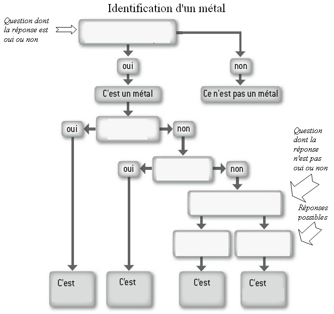2- Votre prédécesseur a laissé le matériel sans mode d'emploi : vous devez construire un document sous forme d'organigramme afin qu'ils procèdent à l'identification, par l'observation ou l'expérience, des métaux que vous leur donnerez.
