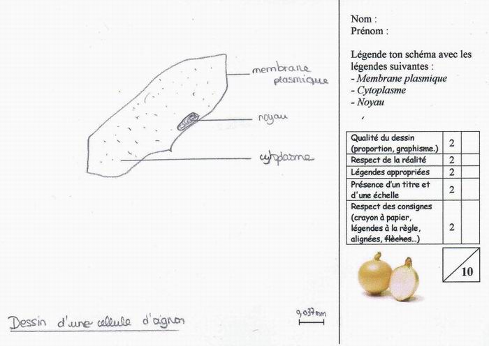 - Un dessin d'une cellule d'épiderme d'oignon effectué suite à une observation réalisée au grossissement x600.