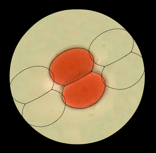 A ce stade, il est nécessaire de bien placer l'objet dans le champ oculaire pour en estimer la taille. Dans cet exemple, il s'agit d'une cellule oeuf d'oursin qui vient de se diviser en deux. L'observation est faite au grossissement x600 |