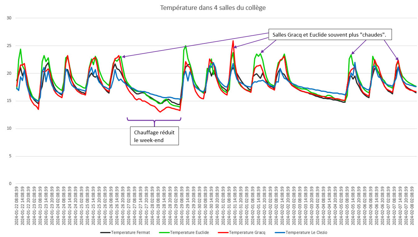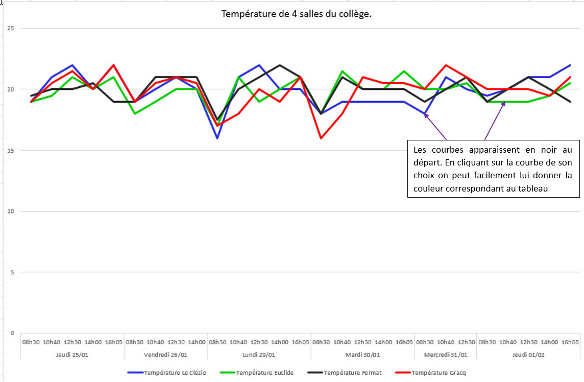 Quatres clés de ce type ont été placés dans les 4 salles au début de ces séances sans que les élèves le sachent. Elles ont relevé les températures toutes les heures pendant une 10aine de jours. Les résultats obtenus et présentés aux élèves figurent ci-dessous :