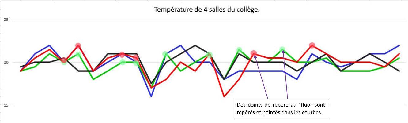 Sur le graphique obtenu on remarque avec les élèves des "pics" de température correpondant à des mesures effectuées dans des salles où il y avait des élèves à l'heure précédente. On marque alors ces points du graphique au fluo (sur le graphique vidéo-projeté de l'enseignant) pour les repérer :