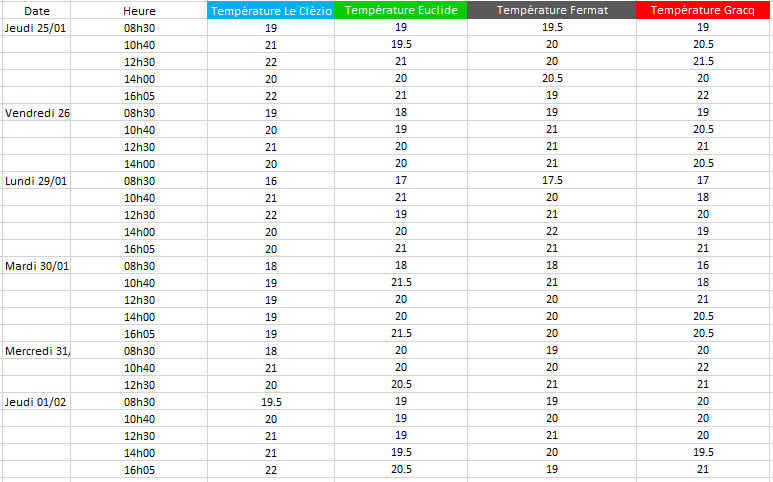 • la salle Fermat (en noir) est au sud, elle devrait être plus chaude que cela. cela vient peut être du fait qu'elle est grande et moins utilisée. Malgré tout elle est exposée au soleil et reste froide.